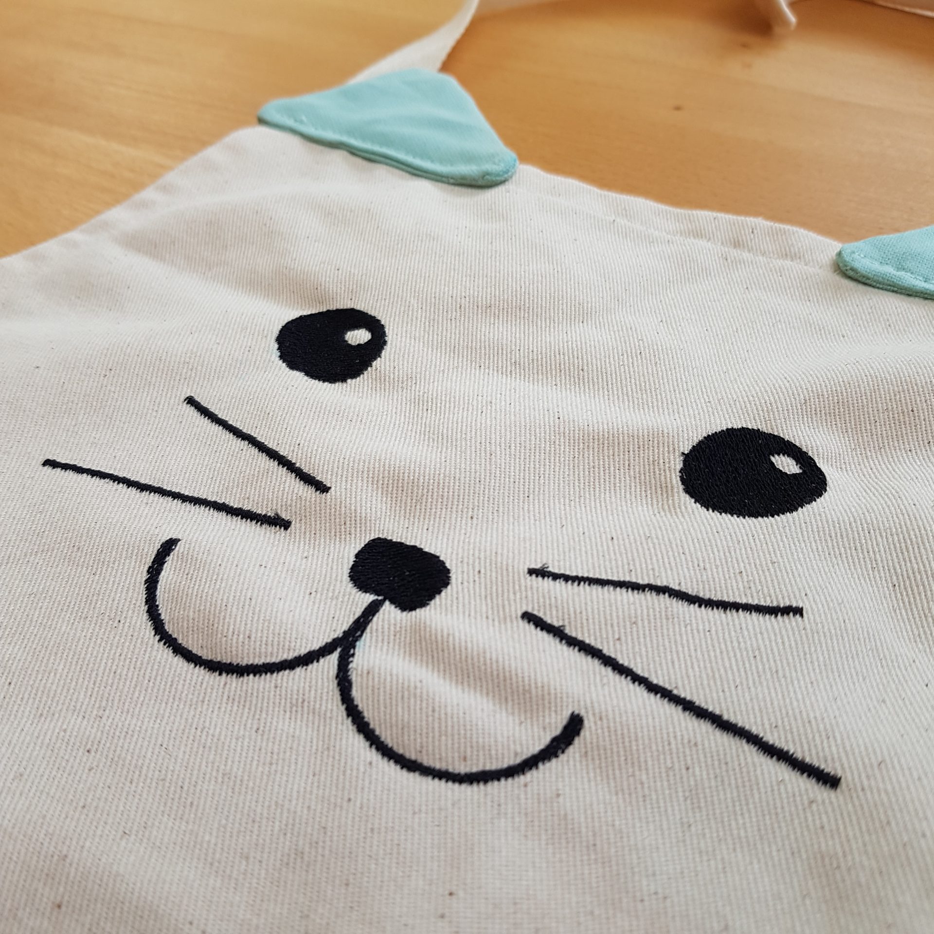 Pour la partie brodée, la tête de chat a été dessinée par mes soins puis numérisée pour être brodée sur ma machine.
