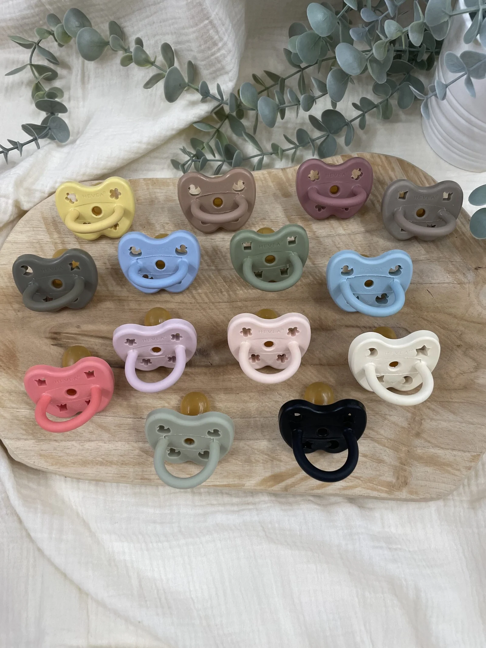 Tétine Hevea 3–36 mois en caoutchouc 100 % naturel. Disponible en plusieurs couleurs & formes (orthodontique, rond, symétrique). Monobloc hygiénique, sans BPA ni PVC.