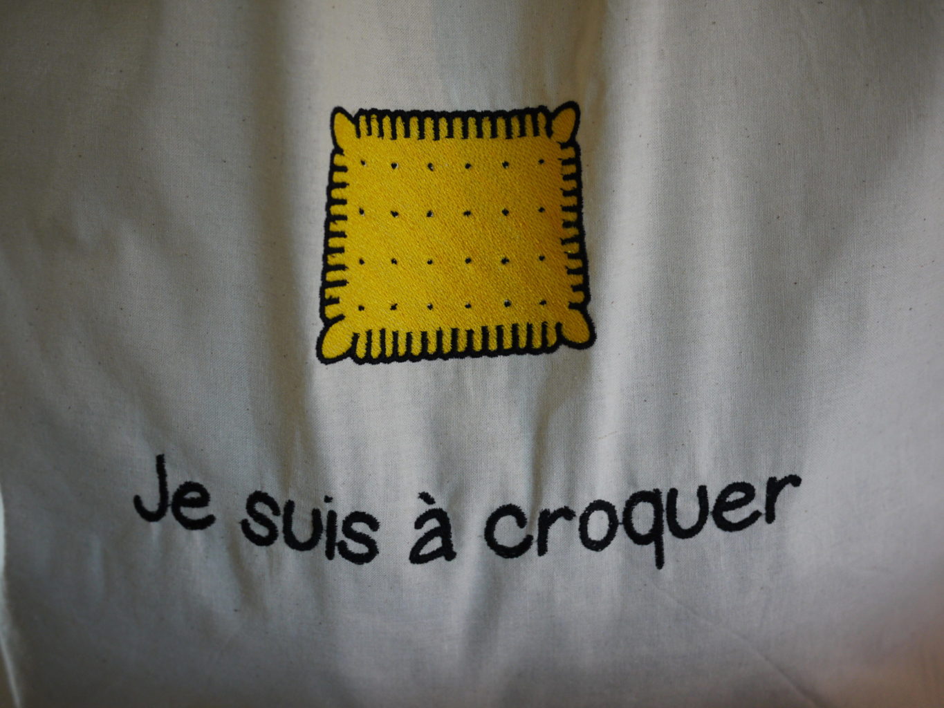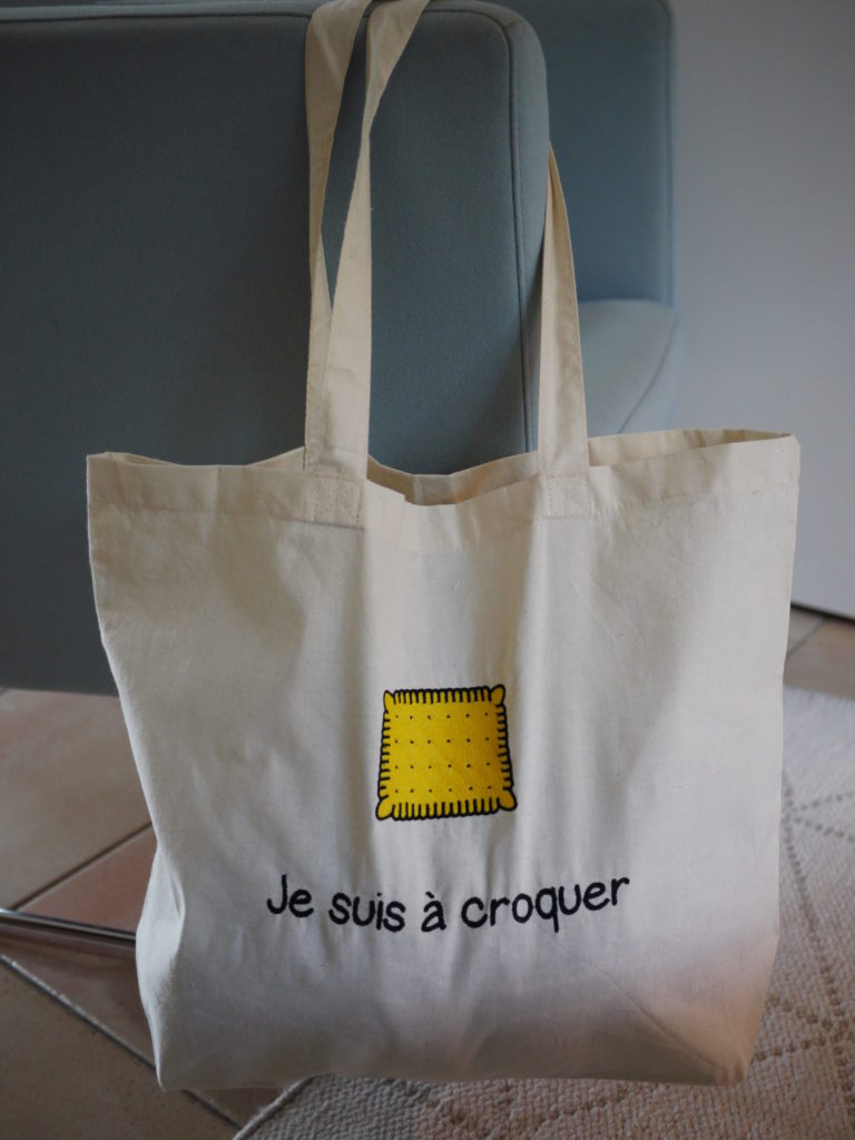 Grand tote bag de shopping décoré d’une broderie originale: Un petit beurre. Clin d’œil à notre ville de nantes.
