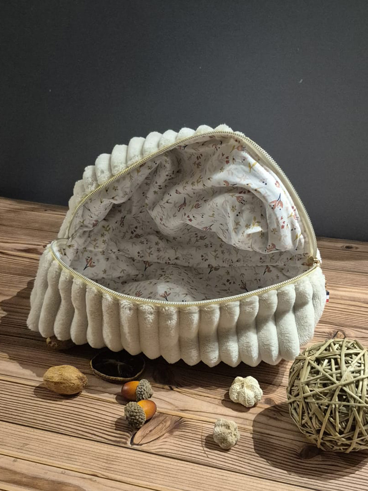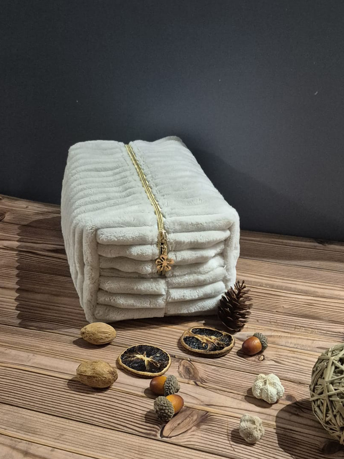 TROUSSE DOUDOUCE ECRUE – TAILLE L Le velours côtelé, un tissu plein de charme qui traverse les temps sans jamais se démoder. Glissez-la très facilement dans votre sac à main, votre sac de voyage ou bien tout simplement dans votre salle de bain. Elle vous permettra de ranger tous vos petits accessoires de toilette, cosmétiques, lingettes lavables, et autres produits. De toute évidence, une trousse pour tout votre bazar dont on a tous besoin ! Emportez-la partout avec vous… Lavage en machine à 30°C ou 40°C ou lavage à la main