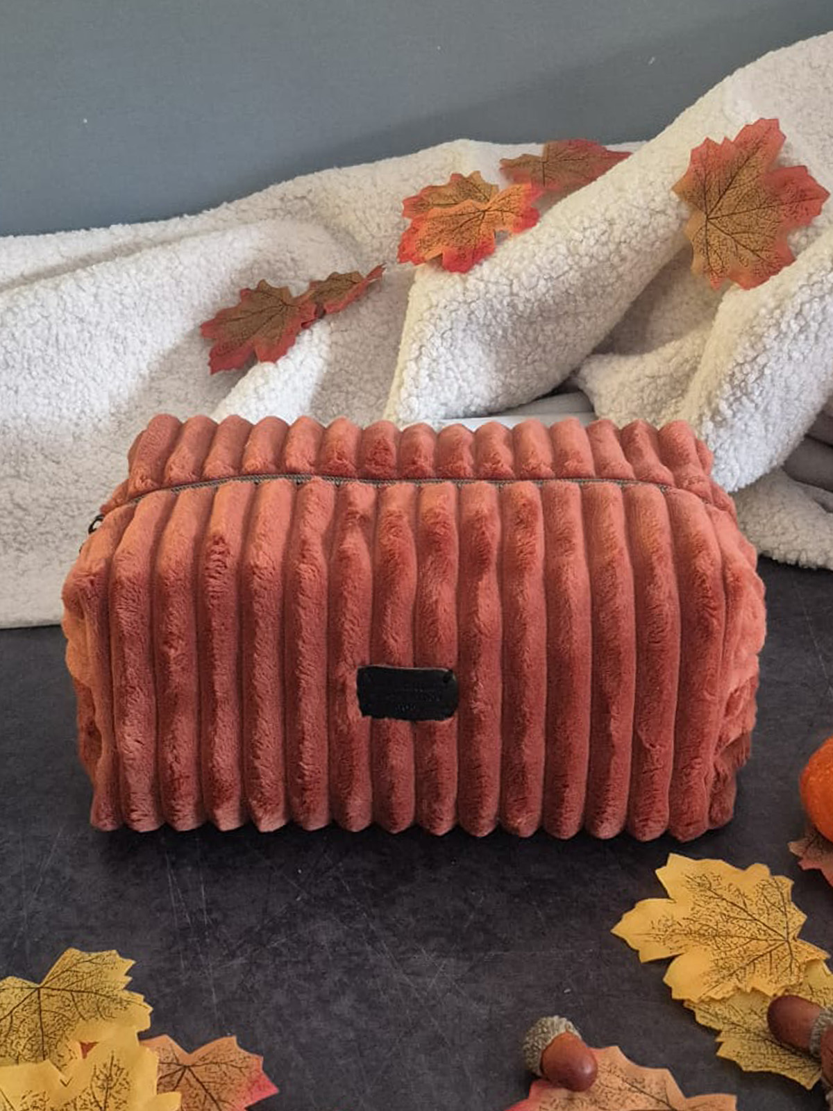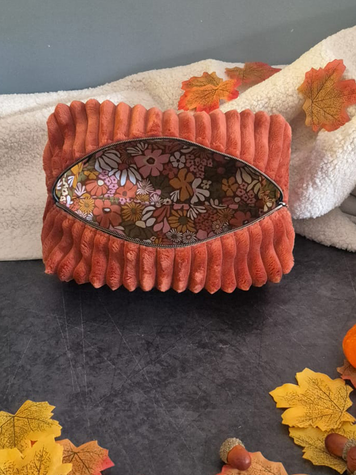 TROUSSE DUODOUCE TERRACOTTA- TAILLE L Le velours côtelé, un tissu plein de charme qui traverse les temps sans jamais se démoder. Glissez-la très facilement dans votre sac à main, votre sac de voyage ou bien tout simplement dans votre salle de bain. Elle vous permettra de ranger tous vos petits accessoires de toilette, cosmétiques, lingettes lavables, et autres produits. De toute évidence, une trousse pour tout votre bazar dont on a tous besoin ! Emportez-la partout avec vous… Lavage en machine à 30°C ou 40°C ou lavage à la main