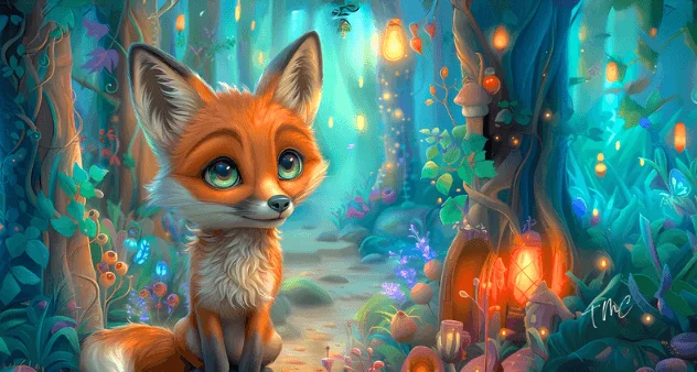 Une face avant illustrée du petit renard dans un décor forestier tout doux