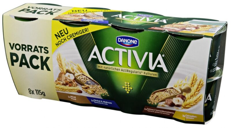 YOGOURT, sucre, 4,5% raisins secs, 2% pomme, 0,9% AVOINE, 0,6% BLÉ, 0,3% NOISETTES, 0,2% AMANDES, arôme naturel. Avec des cultures bifidus ActiRegularis®. Peut contenir d’autres FRUITS À COQUE et d’autres CÉRÉALES CONTENANT DU GLUTEN.