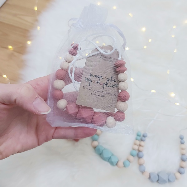 Chaque collier d’allaitement et de portage est soigneusement emballé dans un pochon en organza accompagné de sa notice d’utilisation.