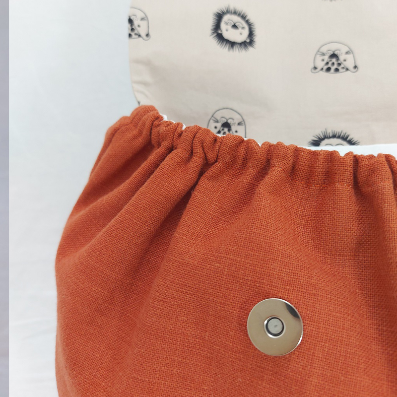 Le rabat est fermé par un joli bouton magnétique. Le haut du sac est complètement élastiqué ce qui permet un accès facile et ainsi plus d’autonomie pour l’enfant.