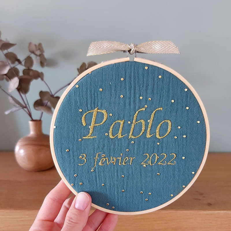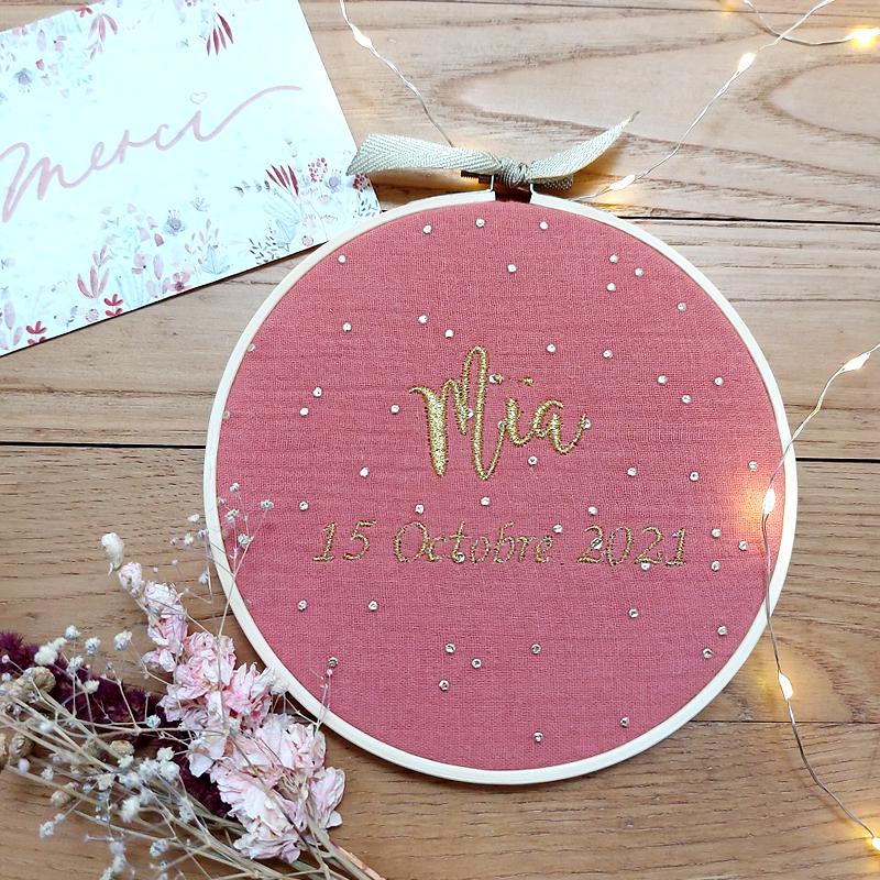 Le raffinement de la broderie et la simplicité du tambourin en bois en font un objet moderne et chic qui saura séduire les jeunes parents.