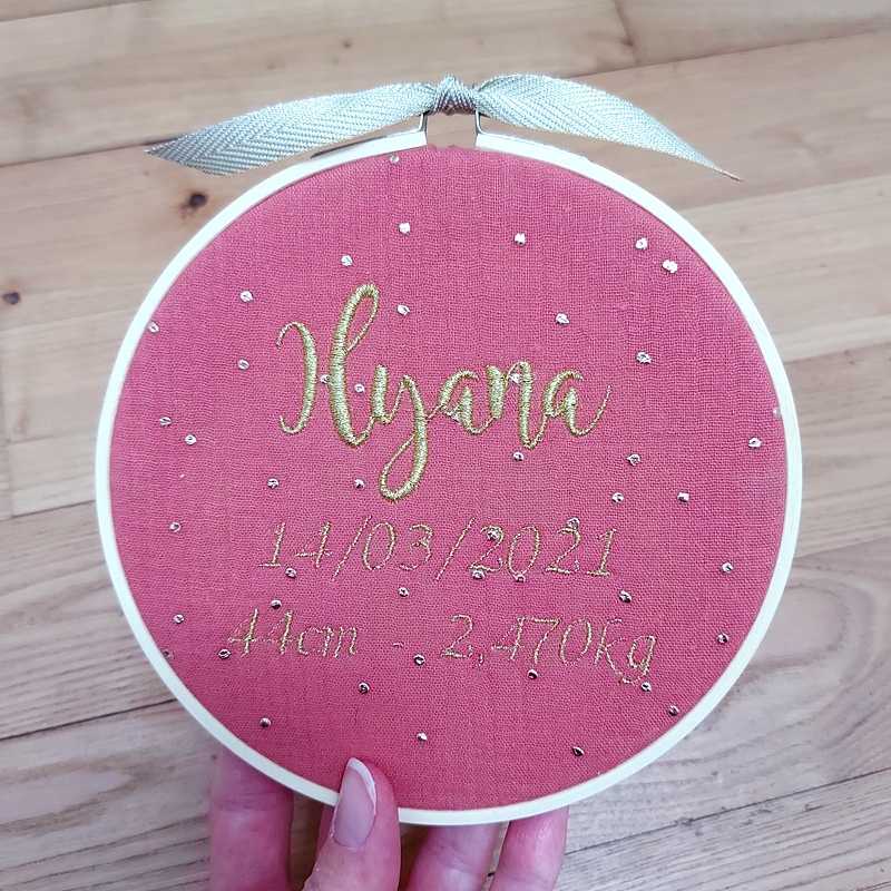 Le raffinement de la broderie et la simplicité du tambourin en bois en font un objet moderne et chic qui saura séduire les jeunes parents.